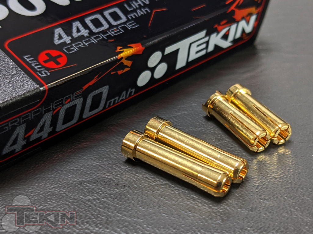 5mm High Power Connectors are standard on Tekin POWER CELL batteries. Gold plated, easy to solder and designed to transfer current efficiently, Tekin Power Plugs cut no corners. 5MM male connectors and 5-to-4mm reducer connectors are included. Balance charge your pack using the 2mm balance port to keep the cell voltages aligned for long lasting power!