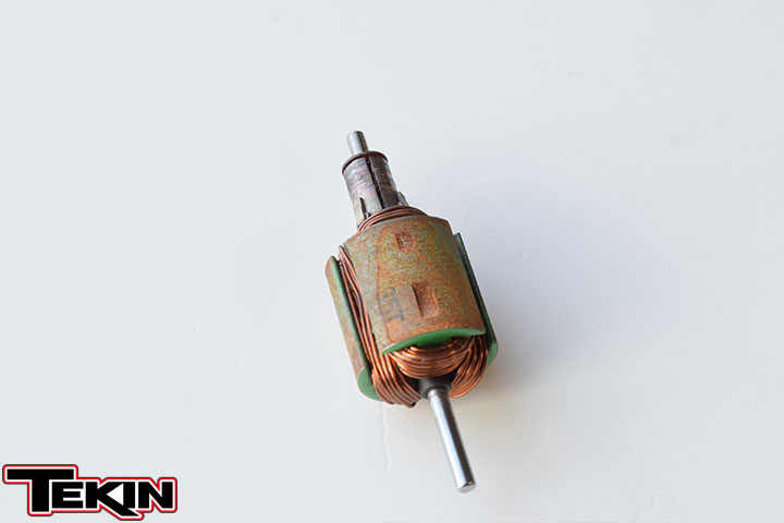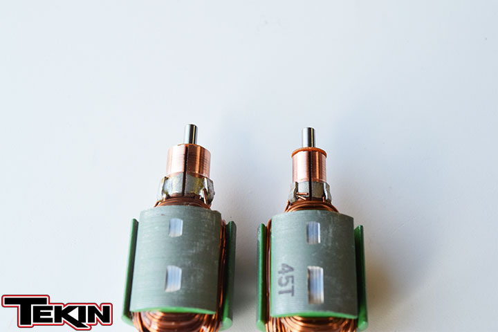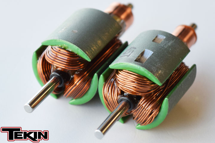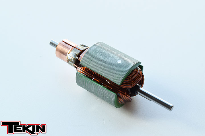 The armature holds the windings, which are lengths of wire(s) wrapped around each arm. Each wrap is called a "turn" and is how the motor ultimately is rated; really all you need to pay attention to when selecting. A 30T motor has 30 wraps (winds) of wire around each arm. Note the differences between the T30 Pro armature (left) and the T45 HD (right, top).