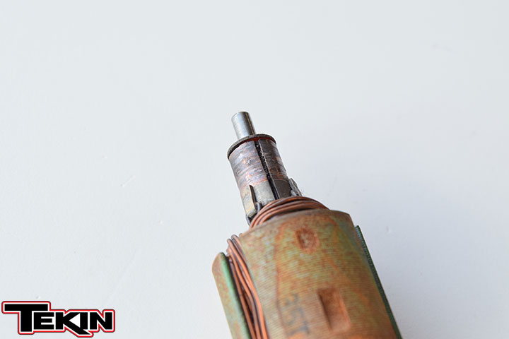 Make sure you keep both shims found on the armature. There should be one on each end! If the comm looks good, reassemble the motor by reversing through the steps above, clean out the brush hood with a pipe cleaner and install new brushes if needed. The comm surface can be cleaned off with an eraser. If there is any black coloring from the arcing, it's a good idea to try to scrub that off the surface before installing the new brushes.